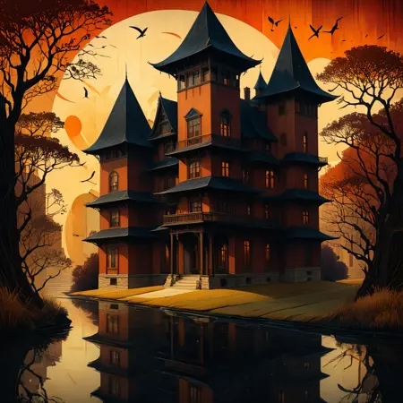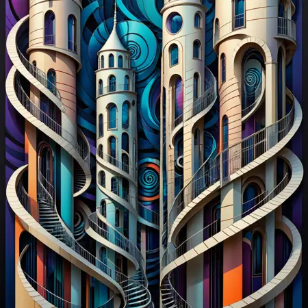 建筑奇观:受 Escher 的楼梯与 Bachelier 的哥特式美学启发,该 LoRA 的建筑元素涵盖宏伟的城堡、扭曲的尖塔,以及被迷宫般路径缠绕的抽象结构。其结果是视觉上惊人的、近乎催眠的结构与混沌的融合。