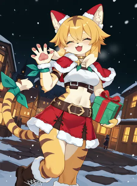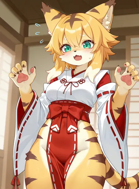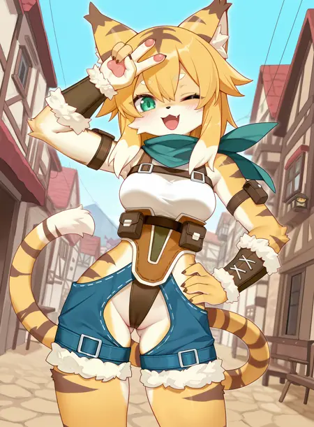 1girl, solo, mia[mia_(world_flipper)], yellow fur, furry female, furry, tiger girl, tail, :3, medium_breasts, green eyes