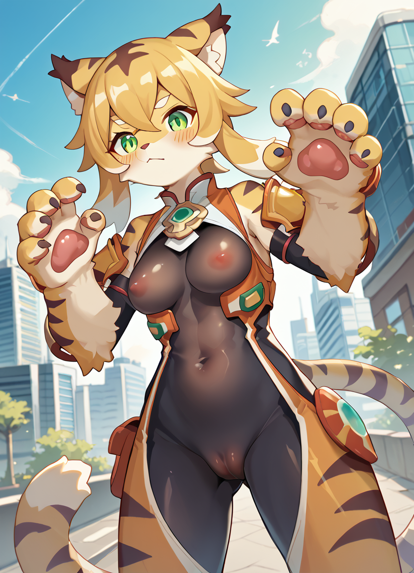 1girl, solo, mia[mia_(world_flipper)], 노란색 털, 퓨리 여성, 퓨리, 호랑이 소녀, 꼬리, :3, 중간 크기의 가슴, 녹색 눈