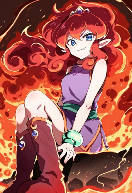 flare_panepon, 赤髪, 火の様な髪, 長髪, 青い目, 尖った耳, 紫色のドレス, 短いドレス, 袖なしドレス, 冠, 尖った歯, ブレスレット, ブーツ, ヒざ上ブーツ, ジュエリー