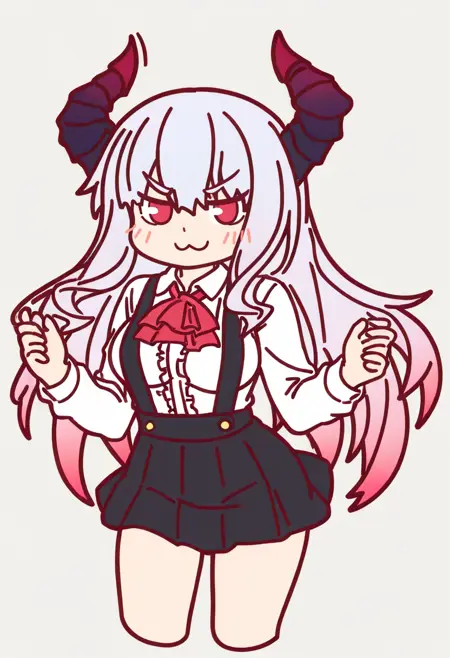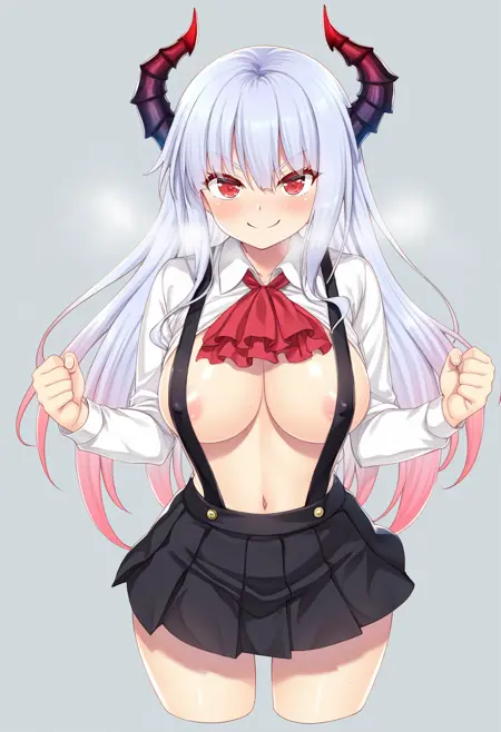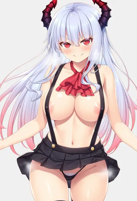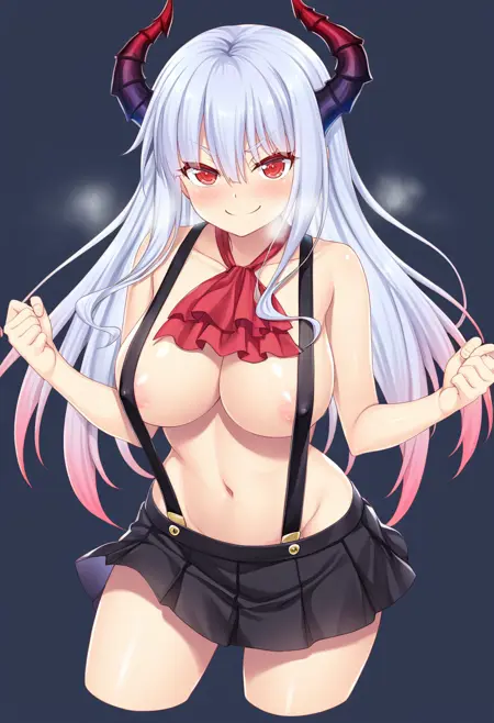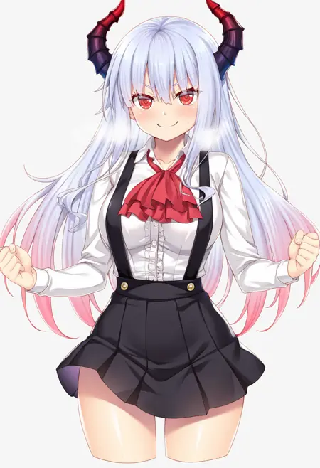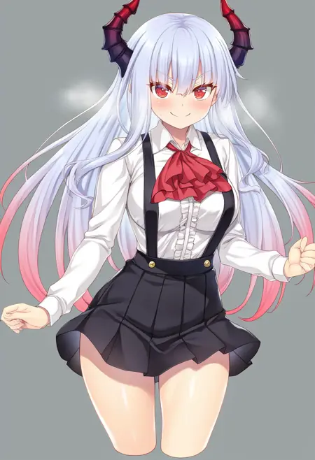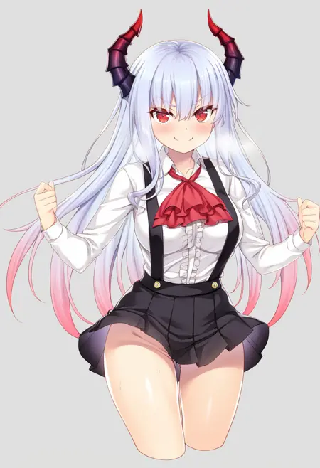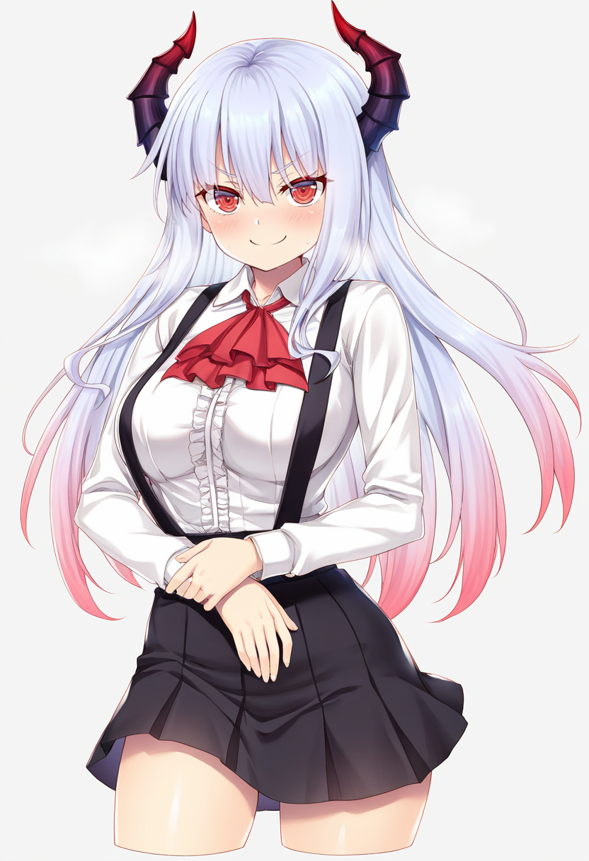 Arco, (white hair), red ascot, red eyes, v-shaped eyebrows, hair between eyes, bangs, dragon horns, long hair, gradient hair, multicolor hair,