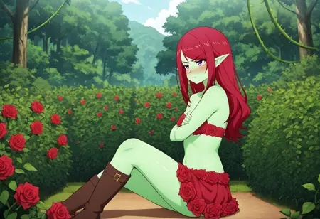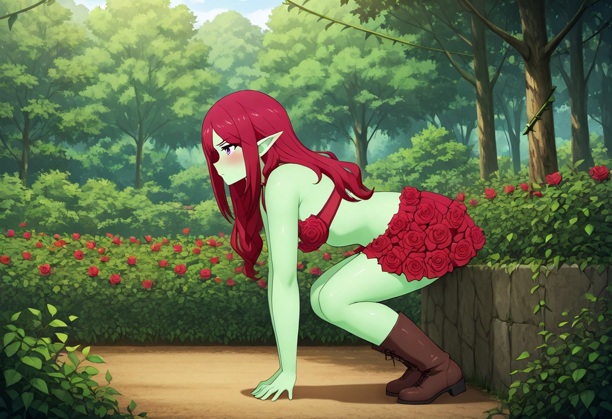 フィオナの服:バラのスカート、バラのブラ、ブーツ、バラ、赤いバラ