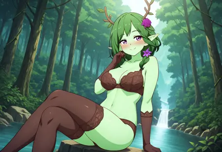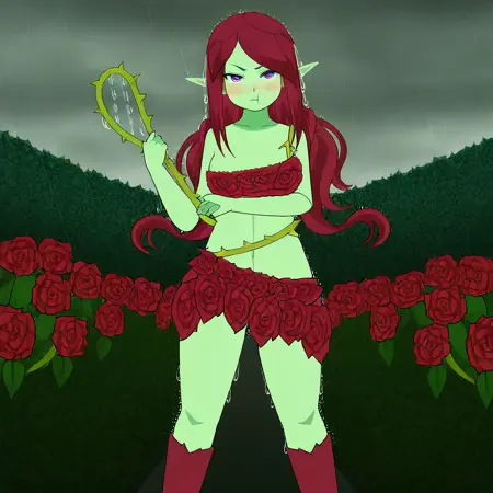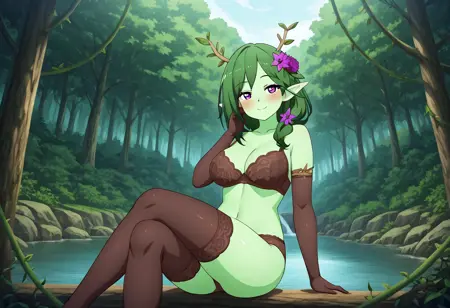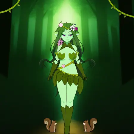 コアタグ:モンスターガール、アルラウネ、緑の肌、紫の目、尖った耳、背が高い女性、ツタ、腹部