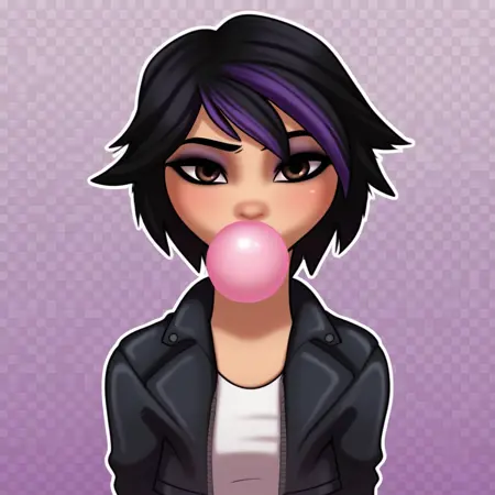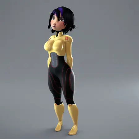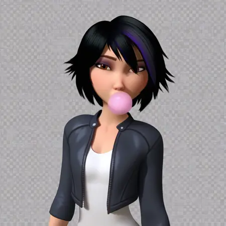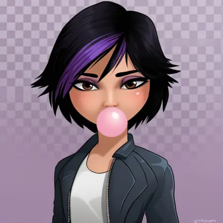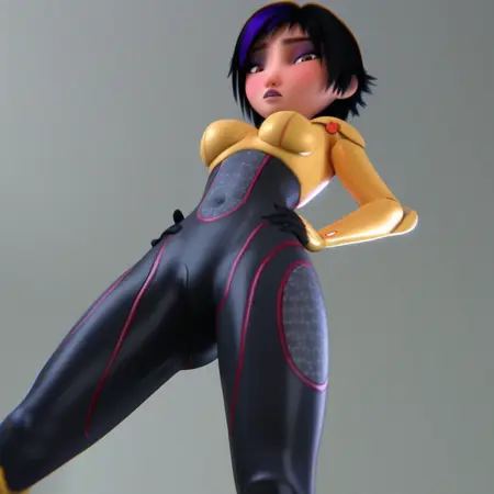 한국인의 얼굴 특징, 키 작음, 창백한 피부, 곡선이 뚜렷한 체형, 넓은 엉덩이, 두드러진 뒷부분, 갈색 눈, 짧은 볼륨 있는 검은 머리에 앞머리에 보라색 하이라이트, 메이크업, 라일락 아이섀도우, 부드러운 블러시, 은은한 핑크 립스틱. 히어로 슈트를 벗고, 팔꿈치까지 길이의 짙은 회색 가죽 자켓을 흰 티셔츠 위에 입고, 옆면에 빨간 줄무늬가 있는 검은 운동용 반바지, 아래에 보라색 패치가 있는 트렌디한 찢어진 짙은 회색 카프리 레깅스, 흰 밑창에 인디고 파랑 줄무늬가 있는 검은 운동화, 검은 오픈 손등 장갑, 왼손목에 흰 줄무늬가 있는 보라색 스웨트밴드를 착용.