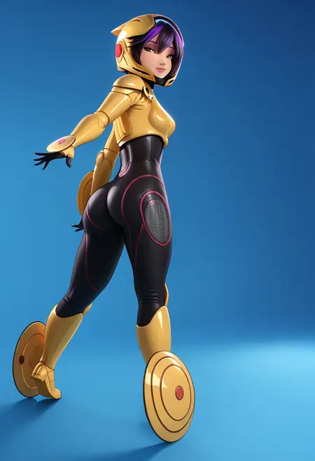히어로 슈트 착용: 치밀한 노란 갑옷, 손목과 신발에 자기 부상 디스크(중앙에 빨간 점 each), 매치되는 헬멧, 비저, 얇은 빨간 줄무늬가 있는 치밀한 검은 바디슈트
