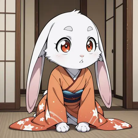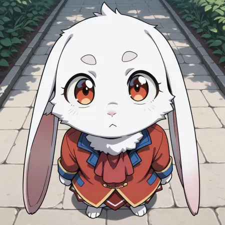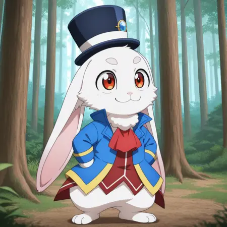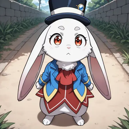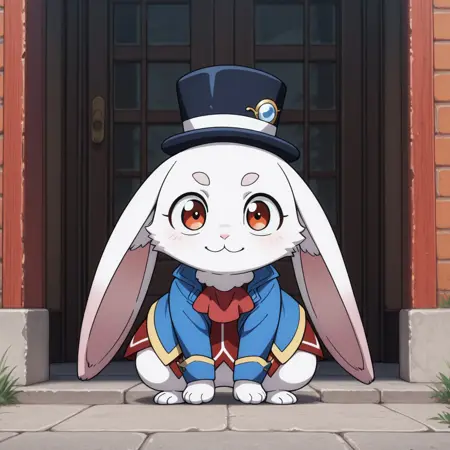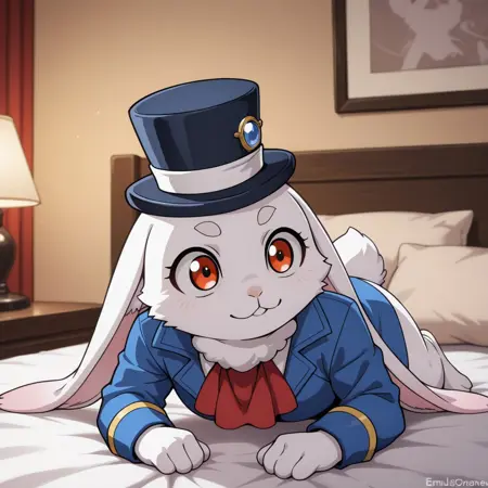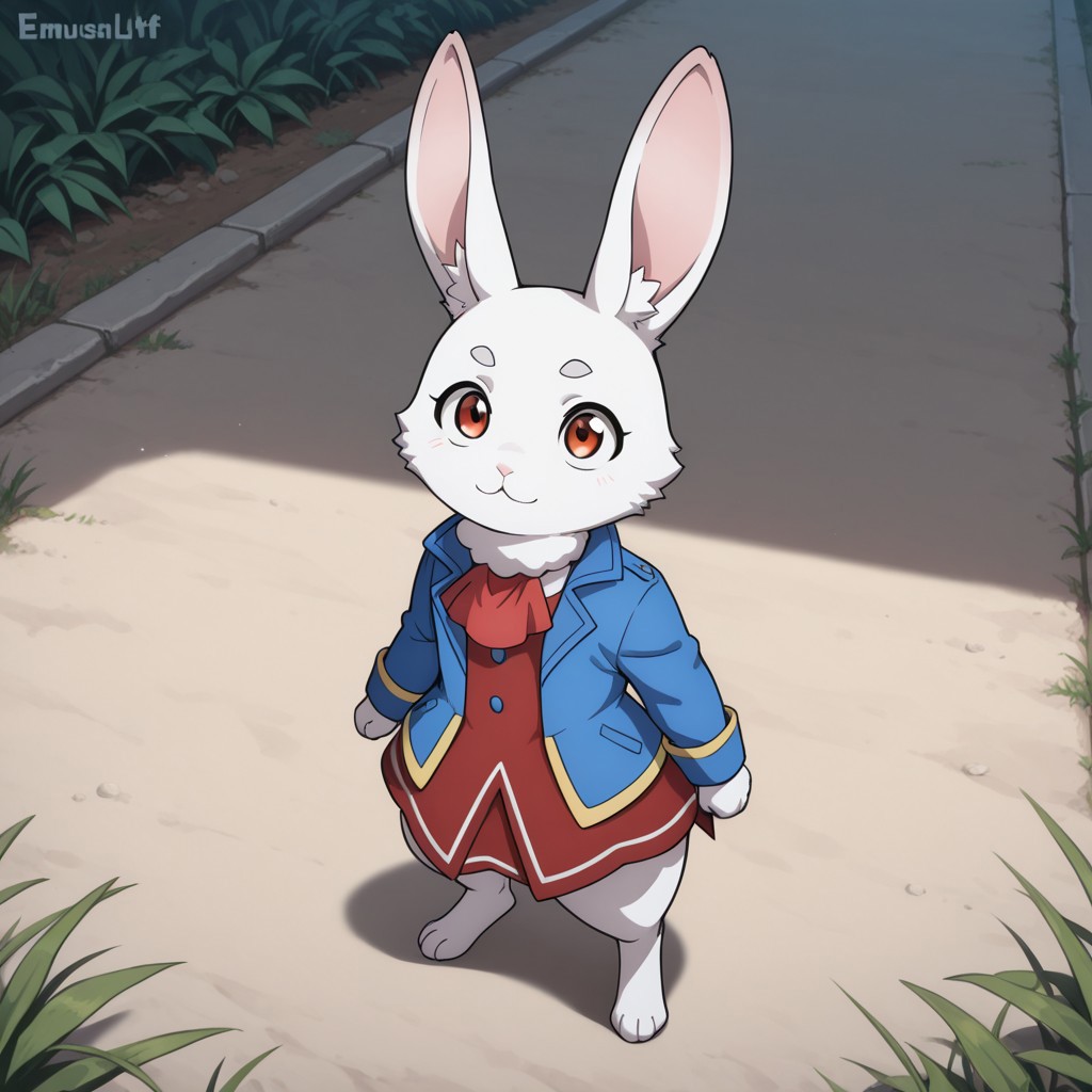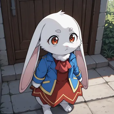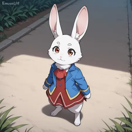emulslfIL, semi-anthro, female, rabbit, white fur, reddish orange eyes, top hat, red dress, blue jacket, red ascot