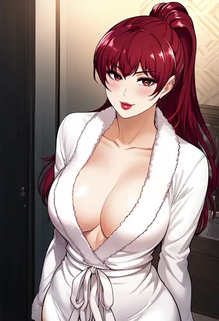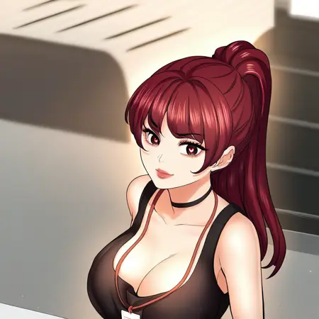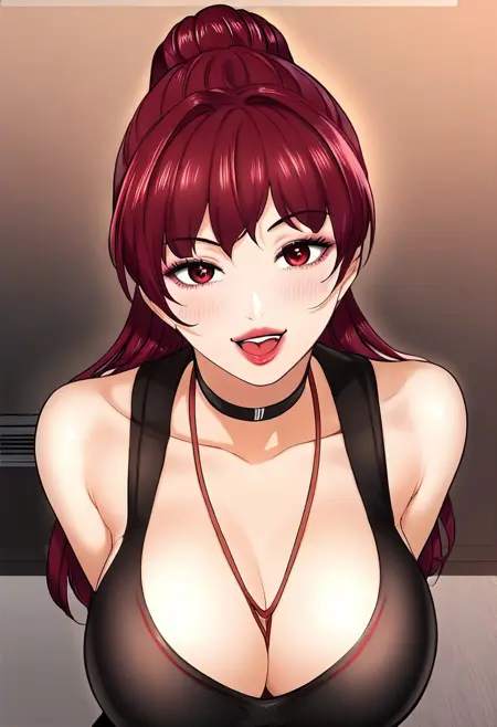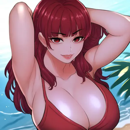 (( lora:park\_chu-yung:1 , park_chu-yung, piercing red eyes, clear eyes, bright pupils, beautiful eyes, beautiful red hair, ponytail, bangs, huge and shaggy breasts, thin waist, wide hips, beautiful skin, natural beauty, extraordinary beautiful woman, attractive woman, super sexy woman, lustful body, sexy woman with seductive obscene body, sensual body, voluptuous body, sexy beauty, ))