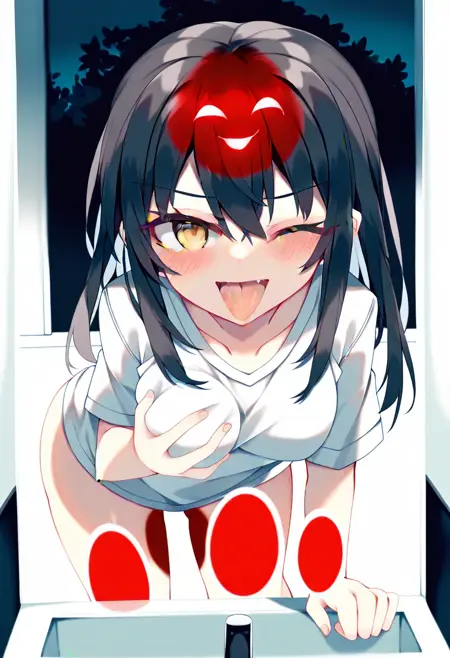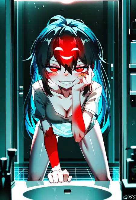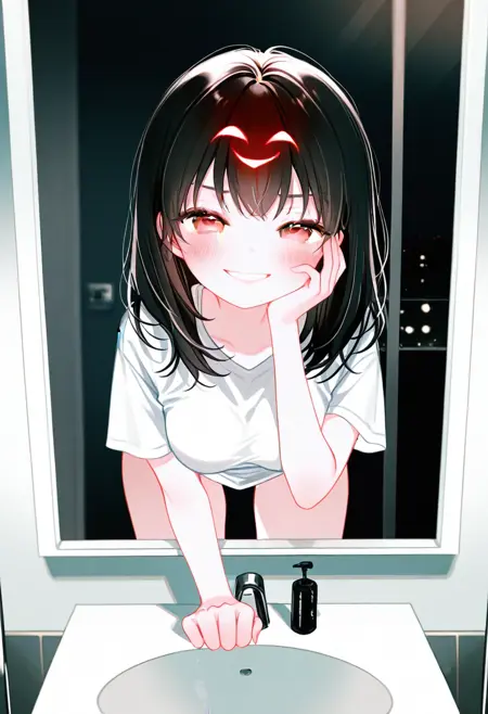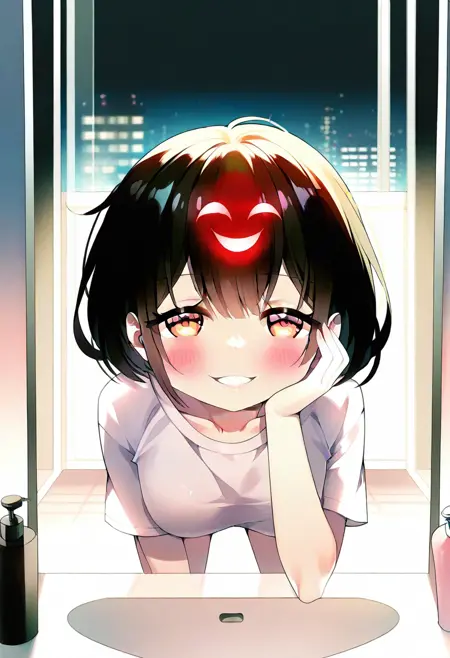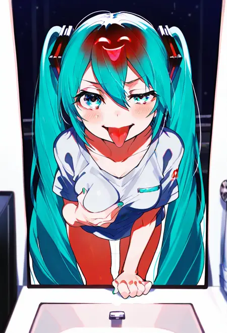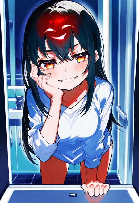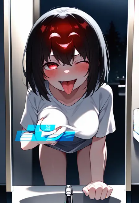 possessed, pov, 1girl, bent over, face on head, uneven eyes, tongue out, glowing eyes, looking at viewer, sink, arm support, index finger raised, pointing, large breasts