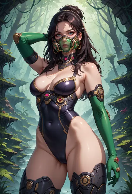 プロンプト:1girl, ultimatefreyna, solo, 茶色の目, 長い髪, 黒髪, 黒のレオタード, 肩出し, ハンモックなし, (フィッシュネット), (フィッシュネットパンティーストッキング), 肘まで手袋, 緑の手袋, 長い手袋, 金属的な装飾が施された未来風太ももまで届くブーツ, 口元マスク, 口を覆う未来風透明マスク, 高レグ, 胸元, 厚い太もも, 胸, 細いウエスト, マスカラ, 光沢のある肌, 睫毛, アイライナー, アイシャドウ, 長い睫毛, 淡い赤い唇