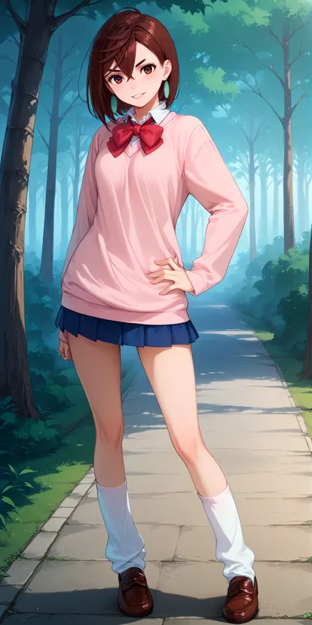 교복: sch007, 분홍색 스웨터, 느슨한 옷, 흰색 칼라 셔츠, 빨간 리본 넥타이, 파란 치마, 주름 치마, 학교 교복, 느슨한 양말, 로퍼,