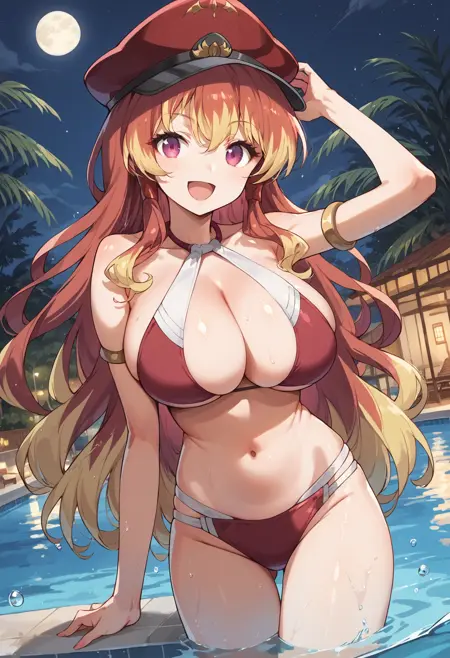 flamingbelial, gradient hair, blonde hair, red hair, purple eyes, very long hair, hair tubes, sidelocks, huge breasts,