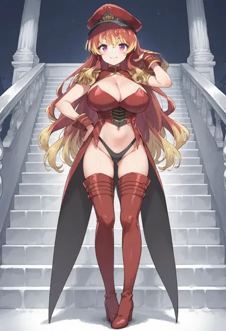 thigh boots, epaulettes, peaked cap, highleg panties, wrist cuffs, corset, midriff, sleeveless, tailcoat,