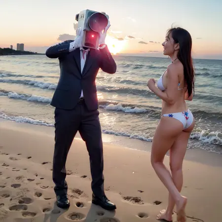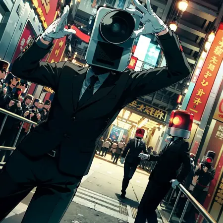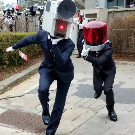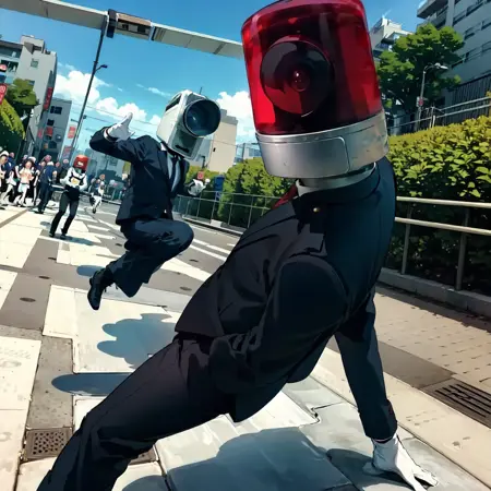 영화관에서 볼 수 있는 그 녀석들입니다. 카메라 남자, 파트램프 남자도 동시에 등장시킬 수 있습니다. 가중치는 1.0으로 안정적입니다. 트리거는 카메라 남자「cameraotoko」, 파트램프 남자「patolampotoko」입니다. 두 인물을 동시에 등장시켜 「arrest」나 「catching」 같은 단어로 체포 장면을 연출할 수도 있지만, 역할이 뒤바뀌는 경우가 많습니다. 그 외에도 「recording」, 「parkour」 등에도 어느 정도 반응합니다.
