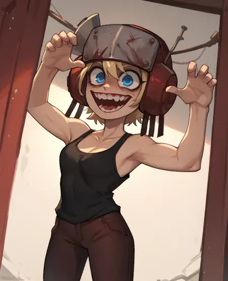 갈색 헬멧, 검은 탱크탑, 바지, 부츠