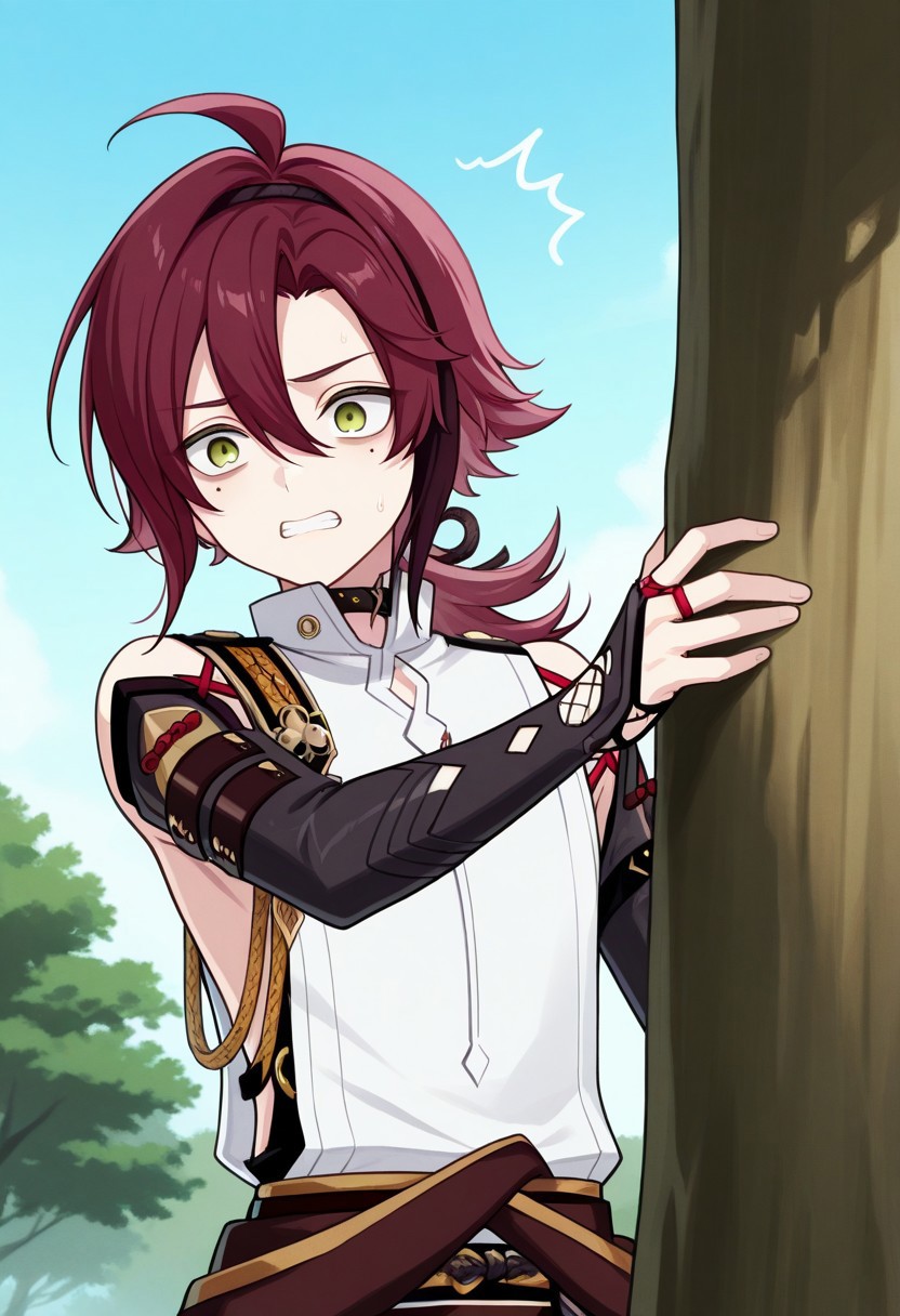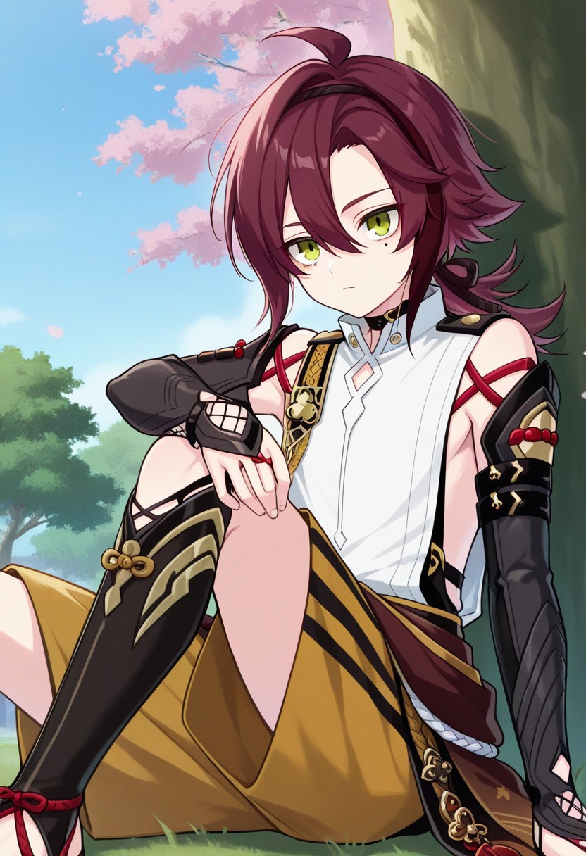 Heizou、1人の男性、男性に焦点、solo、緑の目、頭帯、目の間の髪、前髪、あほ毛、赤髪、黒髪、複色の髪、ストライプ模様の髪、長い髪、ポニーテール、低めのポニーテール、複数のほくろ、目の下のほくろ、日本の衣装、アギュイレット、日本の甲冑、甲冑、腕甲、黒甲、甲、ノースリーブ、シャツ、白いシャツ、チョーカー、黒いチョーカー、ショートパンツ、オレンジのショートパンツ、ゲーター、茶色のゲーター、サンダル、ビジョン(Genshin Impact)