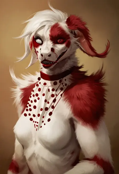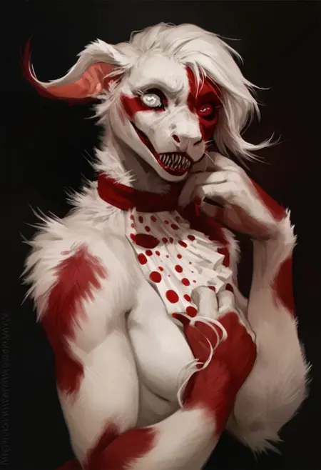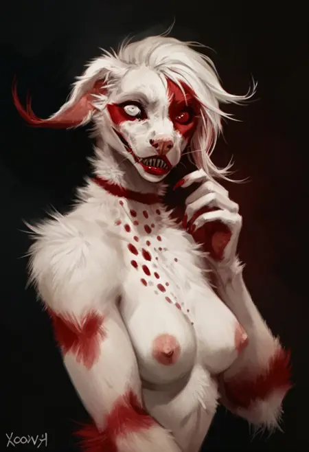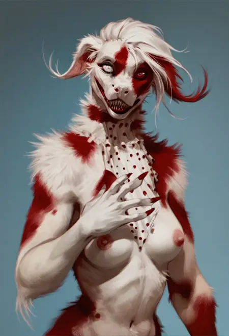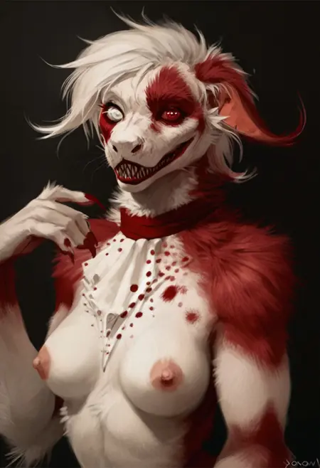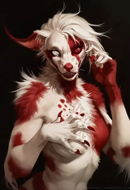 lucyscxl, kivouackian, heterochromia, white eyes, red eyes, red claws, head tuft, white hair, eyelashes,