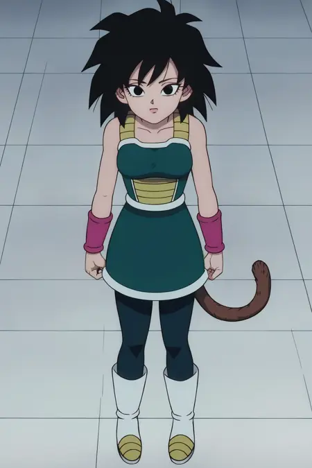 녹색 사이어인 갑옷, 흰색 테두리, 녹색 치마, 스타킹, 검정 다리 착용, 분홍색 팔찌, 흰색 부츠, 이색 부츠