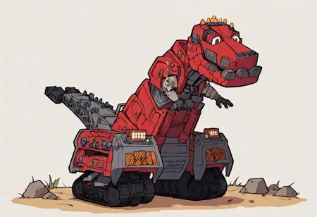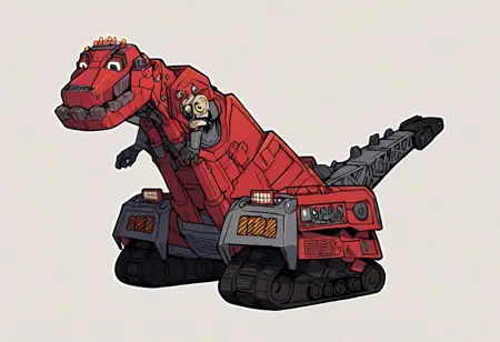 "t-trux, dinotrux, ty_rux, 로보틱 공룡, 건설 차량 하이브리드, 빨간 몸체, 회색 몸체, 기계적 턱, 금속성 이빨, 작은 팔, 3개의 손가락, 금속성 발톱, 크레인처럼 생긴 꼬리, 노란색 조명, tyrannosaurus_rex, 트럭, 하이브리드"