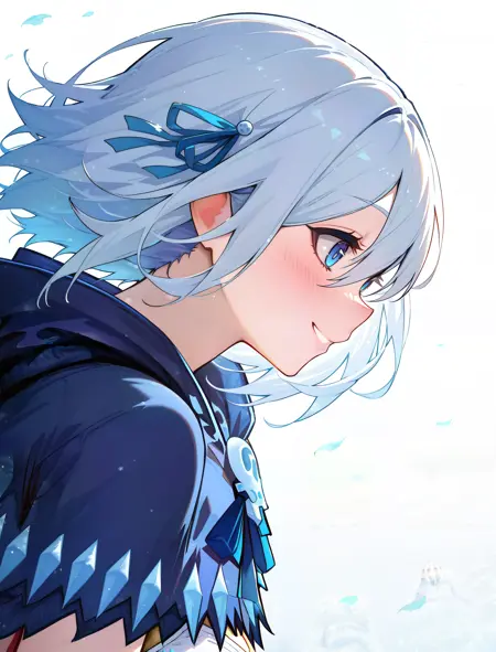 blue cloak, brooch, hood down, white dress, belt, white gloves