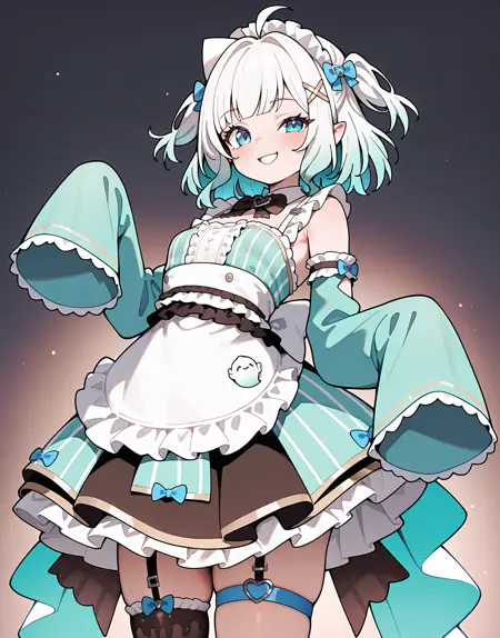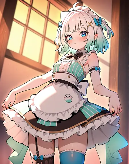 mintfantome, single thighhigh, thigh strap, frills, short hair, twintails,