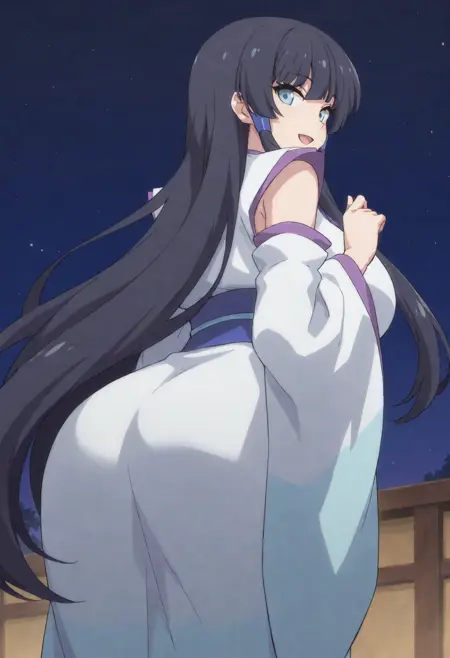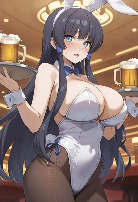 freezingastaroth, black hair, aqua eyes, very long hair, sidelocks, hair tubes, blunt bangs, hime cut, huge breasts