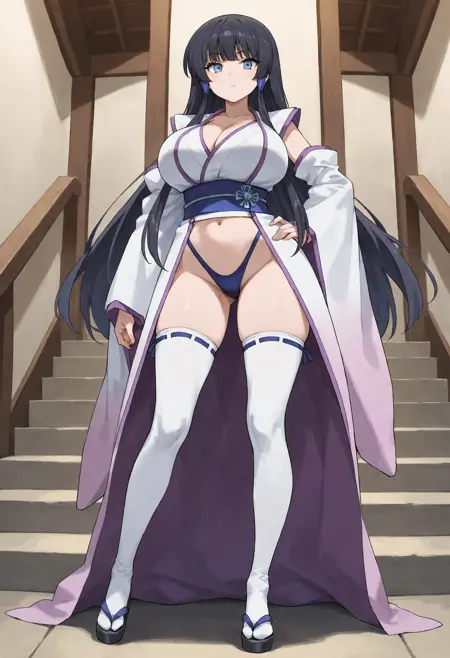 white thighhighs, navel, wide sleeves, detached sleeves, sleeveless kimono, obi, blue panties, ribbon-trimmed legwear, highleg panties,