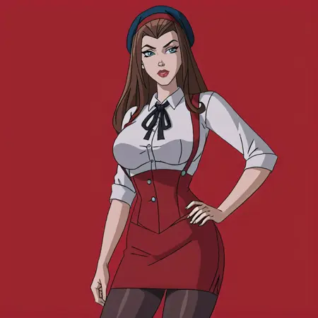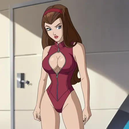 트리거: ScarletWitchWolverineandTheXmen, 1girl, cape, brown hair, elbow gloves, red thighhighs, superhero, long hair, lipstick, large breasts, red leotard, blue eyes, makeup, mask, breasts, cowboy shot