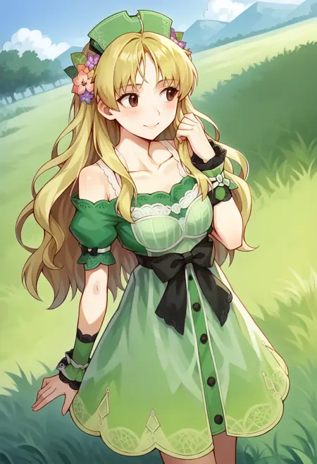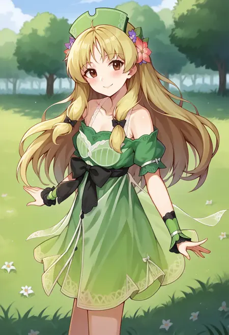 aaayesha, 금발, 갈색 눈, 긴 머리, 머리에 꽃, ayeshadef, 모자, 녹색 드레스, 연한 녹색 드레스, 투명, 녹색 셔츠, 검은 리본, 허리 리본, 손목 커프스, 녹색 치마, 어깨 드러남,