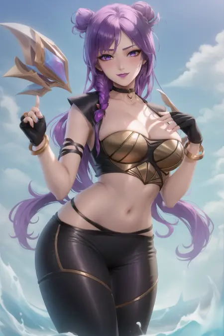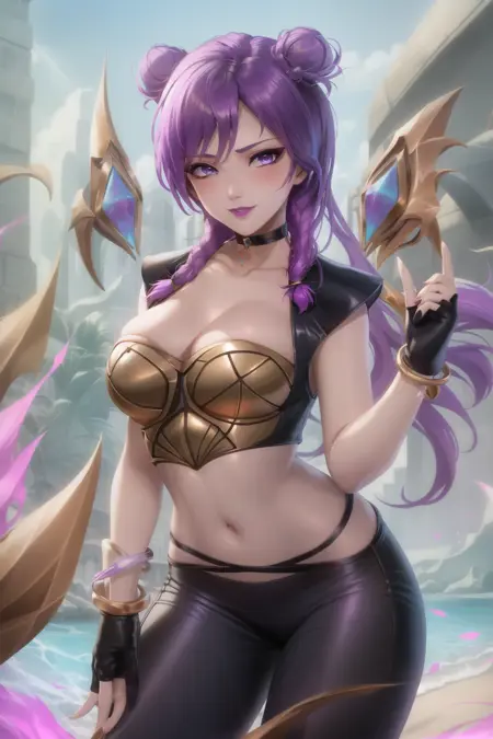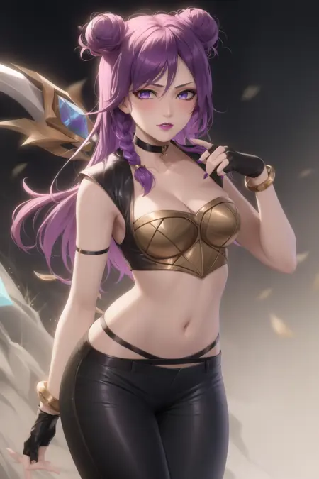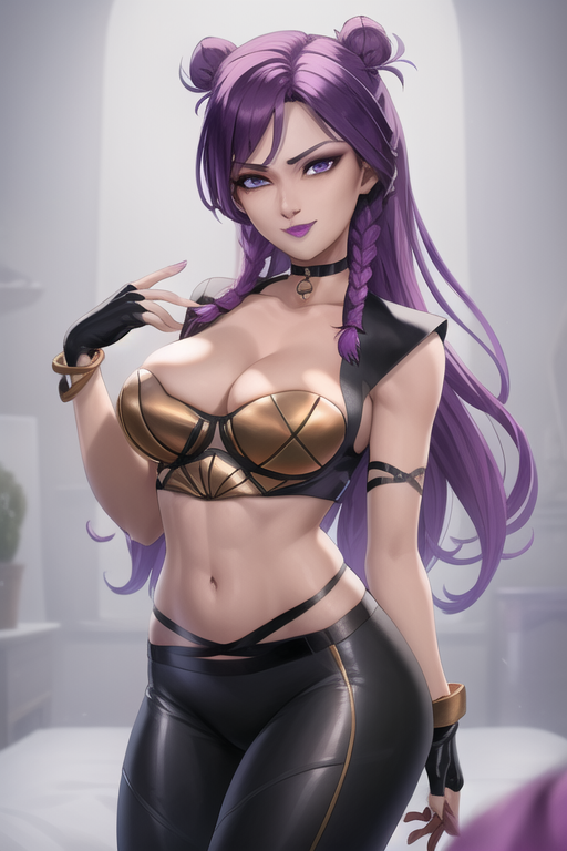 lora:Kaisa-v1-03:0.5, ChopioKaisa, 紫色の髪、長い髪、編み込み、髪の結び目、二重の結び目、紫色の目、化粧、口紅、紫色の唇、観察者を見つめる、(頬の紅潮:1),