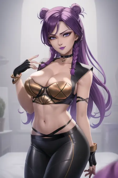 lora:Kaisa-v1-03:0.5, ChopioKaisa, 紫色头发,长发,辫子,发髻,双发髻,紫色眼睛,妆容,口红,紫色嘴唇,看向观众,(脸颊泛红:1),