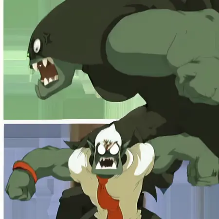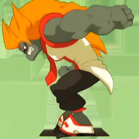 Rubilax,orange hair,long hair,fangs,pointy ears,colored skin,grey skin,forehead jewel,third eye,tusks,