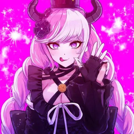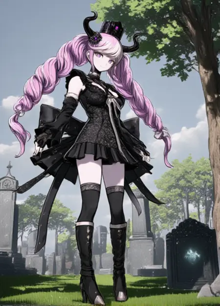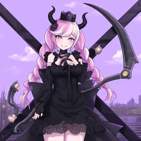 标准服装:“死神是一位年轻女性,拥有紫色的眼睛。她有两条长长的粉白相间的发辫,用小巧的白色蝴蝶结固定。左侧有刘海,由一枚黑色花朵发簪固定。她头戴一顶黑色王冠,装饰着粉红色和黄色的饰品,并长有两根黑色角。她穿着一件贴身的黑色短裙,裙身带有玫瑰花纹,裙装展现出大量胸部轮廓。裙子后部系着一个大蝴蝶结。死神穿着黑色及膝长袜和带有银色鞋头的厚重长靴。”