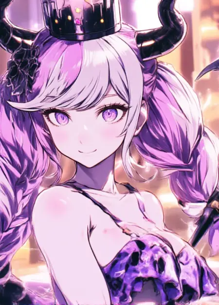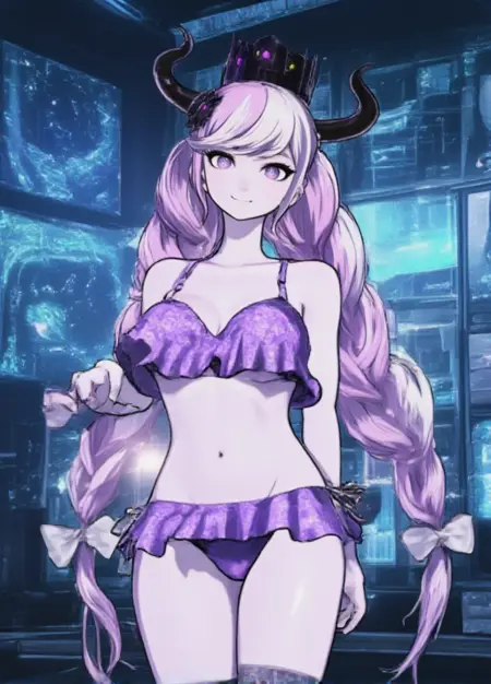 比基尼:“死神是一位年轻女性,拥有紫色的眼睛。她有两条长长的粉白相间的发辫,用小巧的白色蝴蝶结固定。左侧有刘海,由一枚黑色花朵发簪固定。她头戴一顶黑色王冠,装饰着粉红色和黄色的饰品,并长有两根黑色角。她穿着一套紫黑配色的两件式泳装,泳装展现出大量胸部轮廓。上衣为褶边式无肩带设计,心形领口,采用浅紫色布料,搭配深黑色镶边。下装为紫黑相间,侧面饰有小蝴蝶结。”