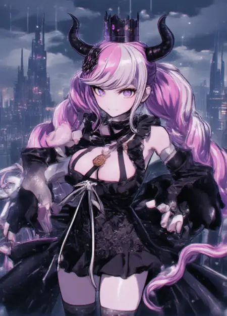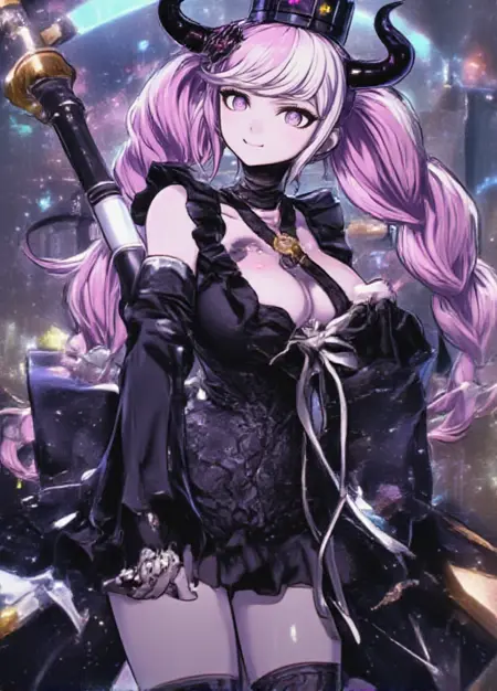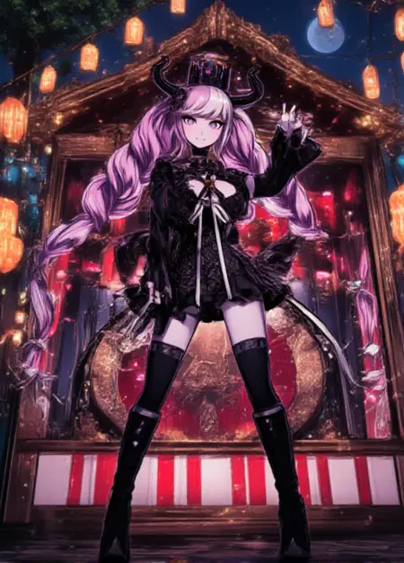动漫风格(特指游戏原画师小松崎ルイ的画风):“图像采用小松崎ルイ的动漫画风。画面突出表现大而富有情感的眼睛和夸张的发型,色彩丰富多样。画面细节极为精致,包括服装、配饰和背景元素上的复杂纹路。图像融合了可爱迷人的元素与黑暗、诡异的主题。人物姿态充满动态与戏剧性,整体呈现出鲜艳色彩与极具表现力的角色设计的强烈对比。”