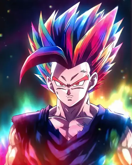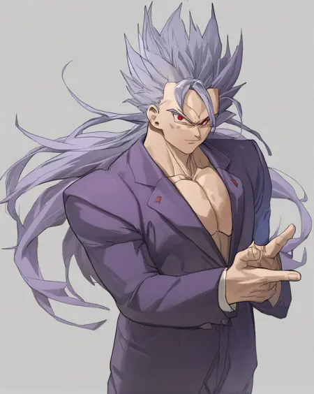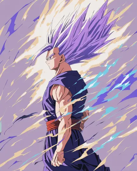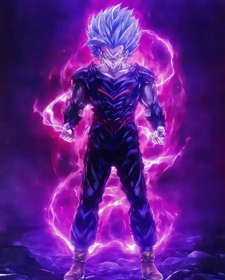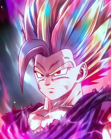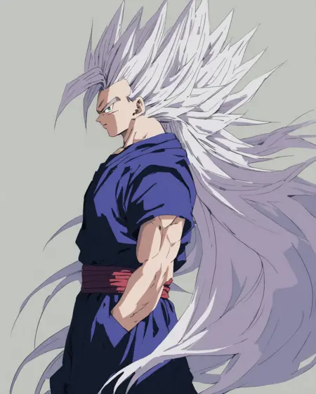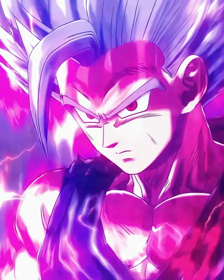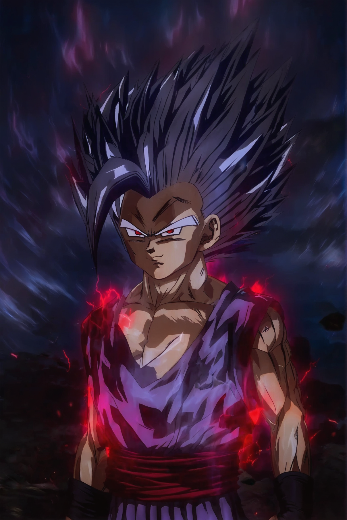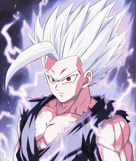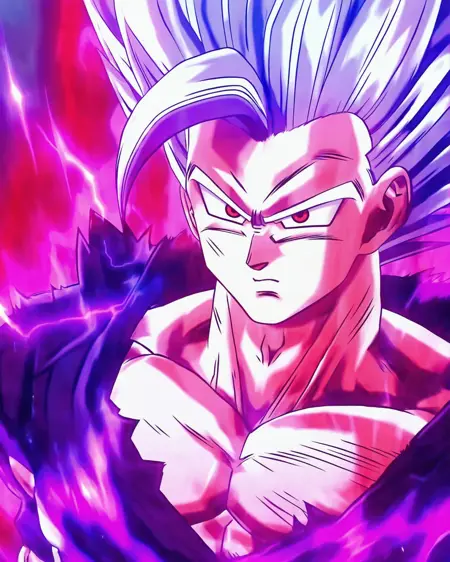 Gohan Beast with intense ki aura around his body and Spiky Long White Hairs, serious expression, red eyes
