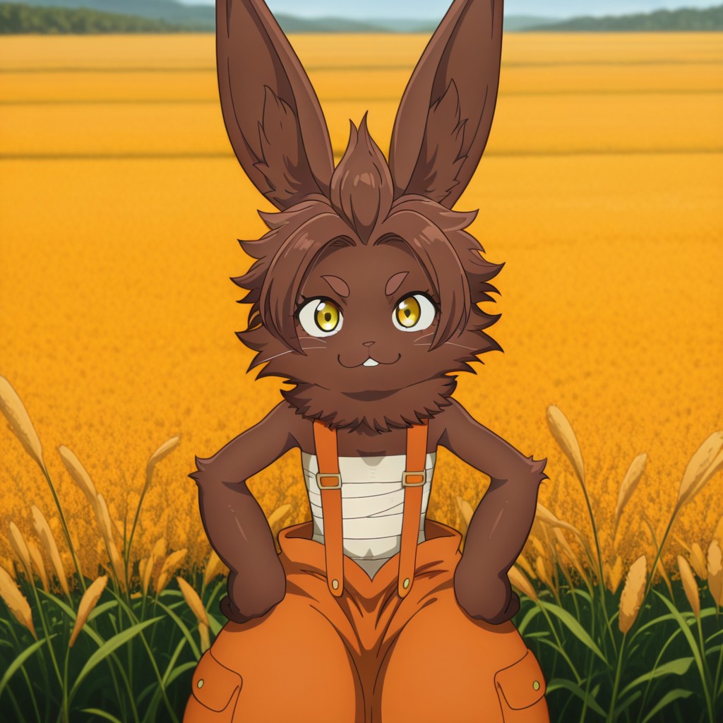 BilacslfILv2, semi-anthro, female, rabbit, brown fur, whiskers, brown hair, gold eyes, orange overalls, sarashi,