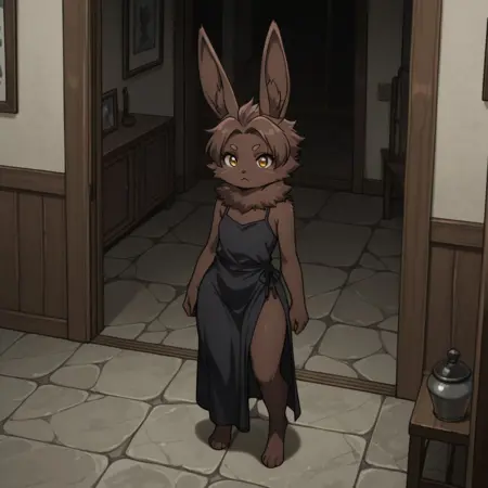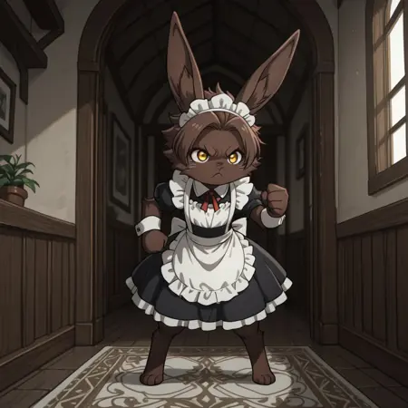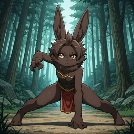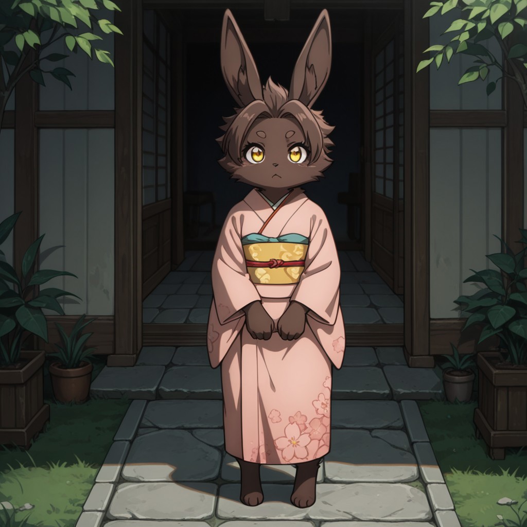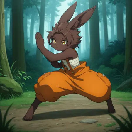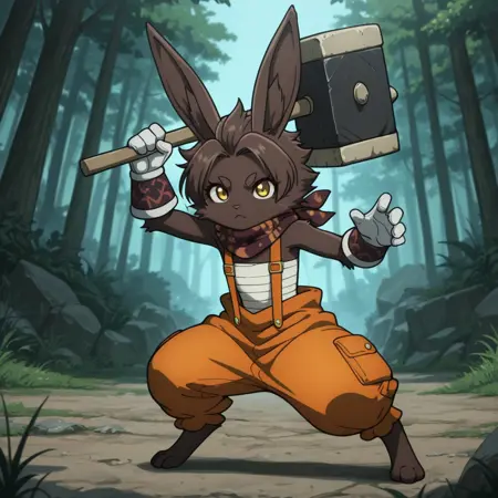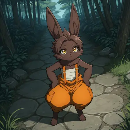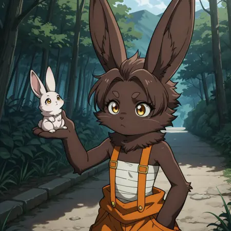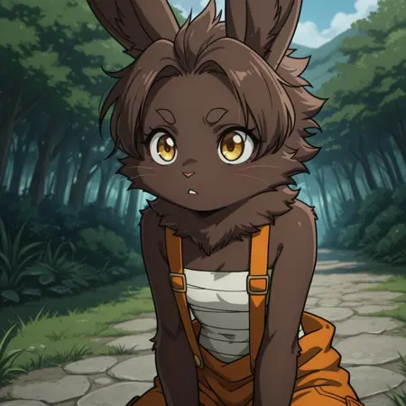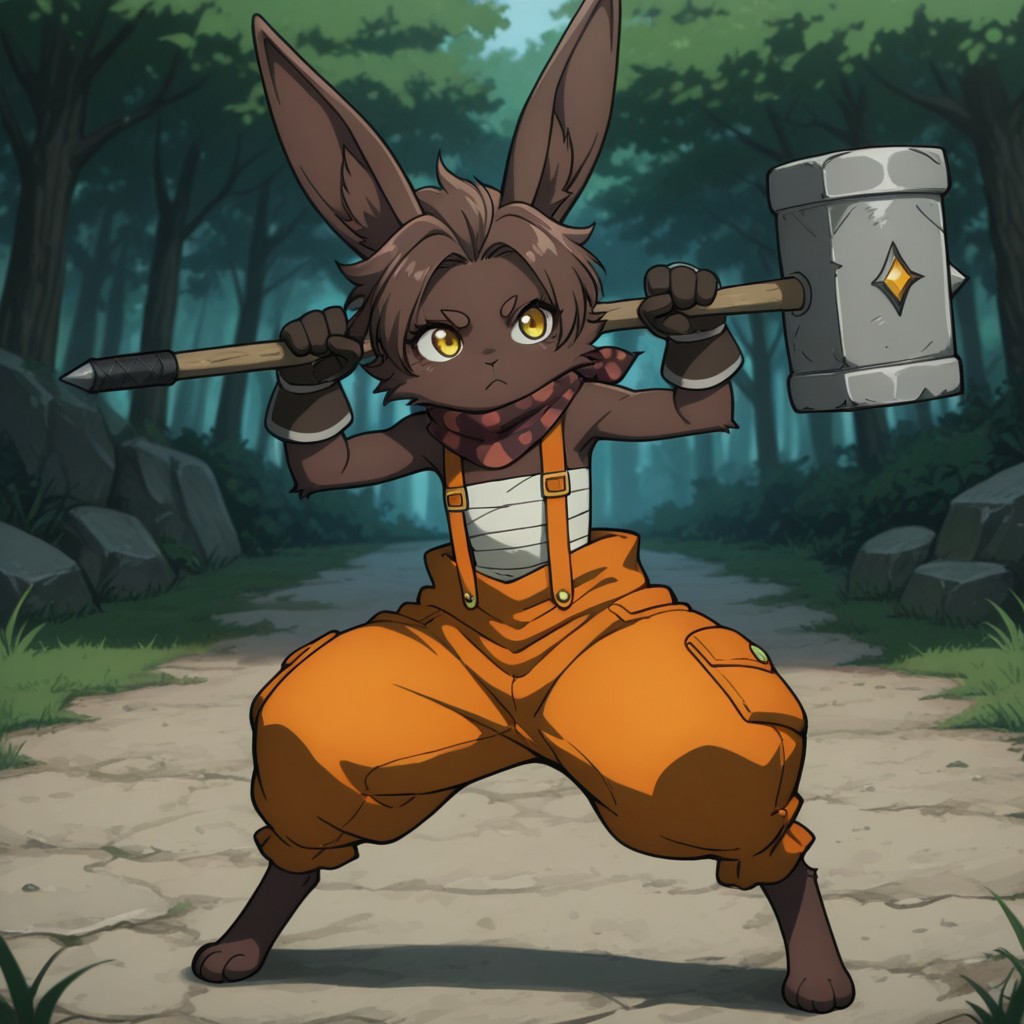 BilacslfIL, semi-anthro, female, rabbit, brown fur, gold eyes, orange overalls, sarashi,