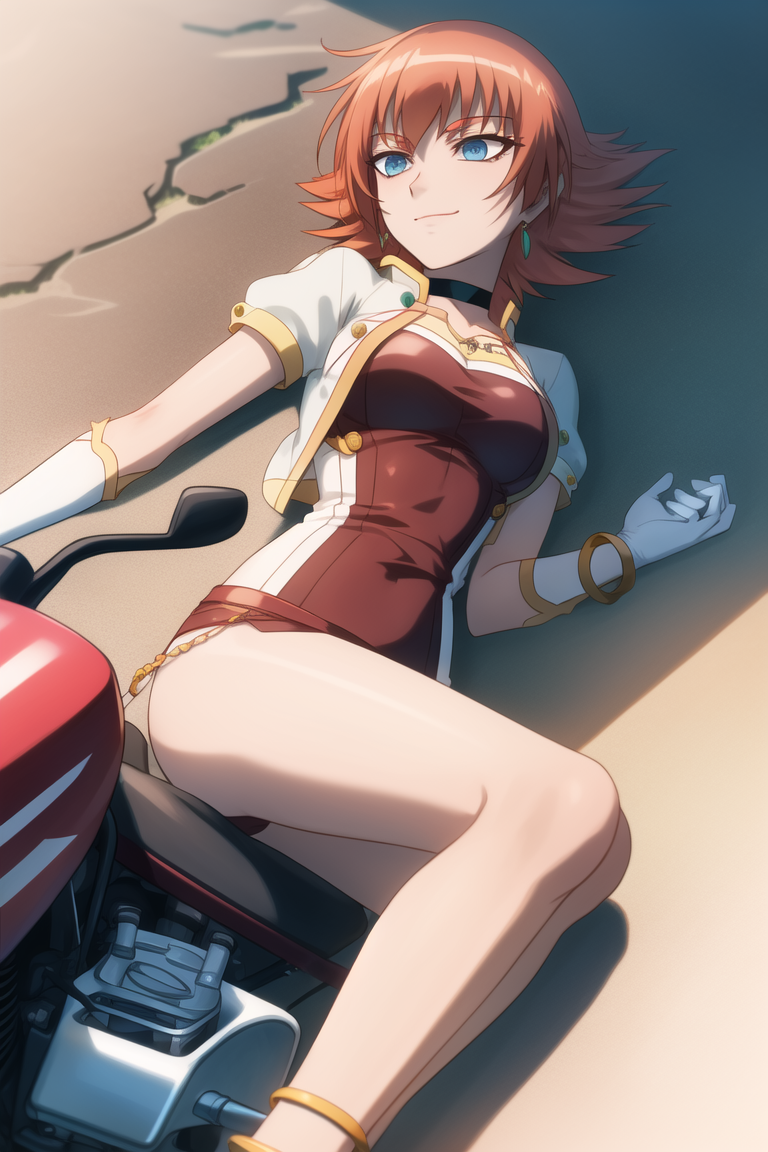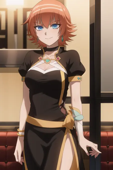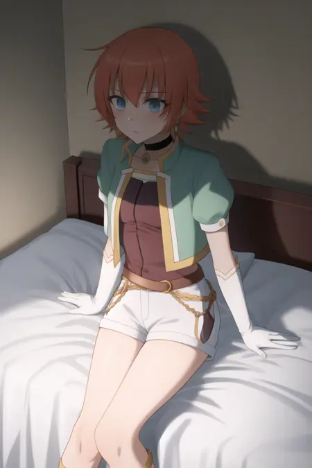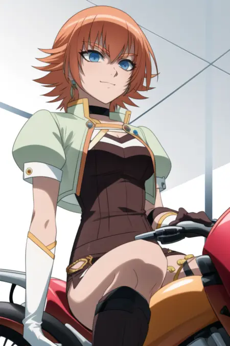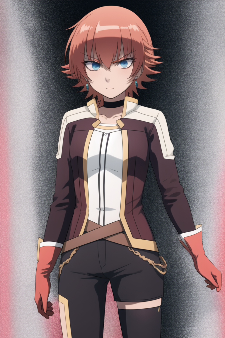 그녀의 전형적인 복장을 얻으려면 다음을 추가해 보세요: "주황색 머리, 파란 눈, 목걸이, 가슴 노출, 흰색 부츠, 한쪽 다리만 덮는 바지, 드러난 허벅지, 풍성한 소매, 재킷, 흰색 팔장갑, 비대칭 다리 착장, 비대칭 옷차림, 바디수트".