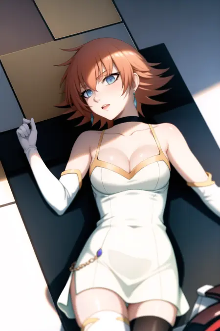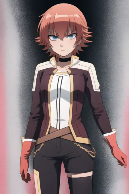 彼女の典型的な衣装を出したい場合は、次を追加してください:「オレンジ色の髪、青い目、チョーカー、胸元、白いブーツ、片方だけのズボン、太ももを露出、ふわふわの袖、ジャケット、白い肘グローブ、左右非対称の脚元装飾、非対称な服、ボディスーツ」。