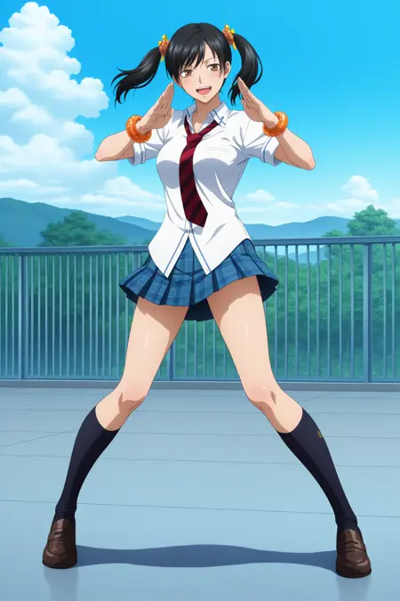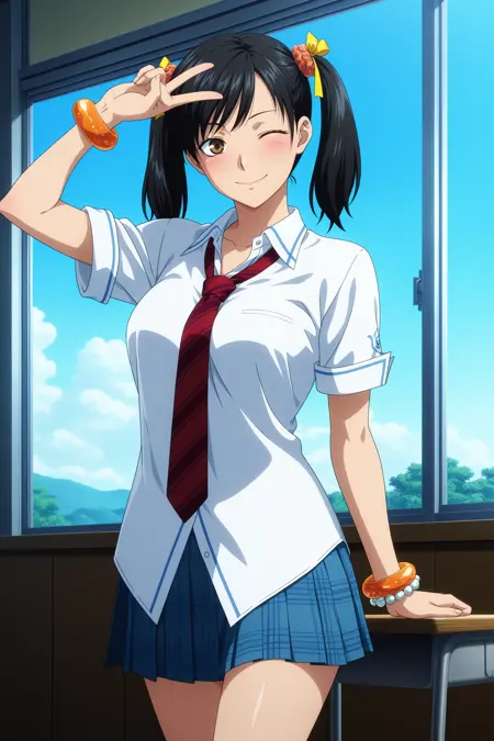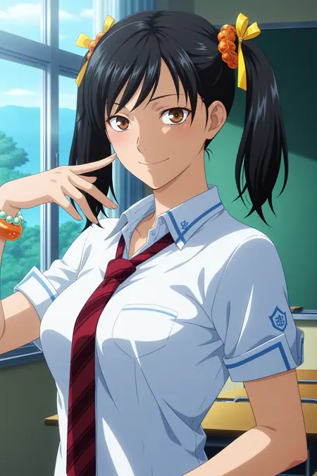 링 소유, 검은 머리, 더블테일, 노란색 머리리본, 주황색 머리끈, 앞머리, 갈색 눈, 학교 유니폼, 흰 셔츠, 칼라 셔츠, 반소매, 소매 말아올림, 빨간 넥타이, 줄무늬 넥타이, 밖으로 내민 셔츠, 파란 치마, 체크무늬 치마, 주름 치마, 주황색 팔찌, 구슬 팔찌, 검은 무릎높이 양말, 로퍼
