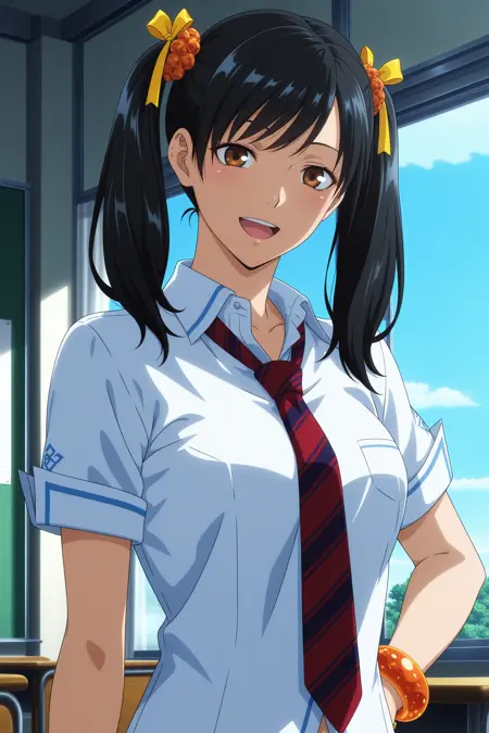 ling xiaoyu, black hair, twintails, yellow hair ribbon, orange hair tie, bangs, brown eyes, school uniform, white shirt, collared shirt, short sleeves, sleeves rolled up, red necktie, striped necktie, untucked shirt, blue skirt, plaid skirt, pleated skirt, orange bracelet, bead bracelet, black kneehighs, loafers