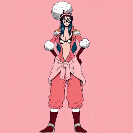 PorcheOP, 1소녀, 혼자, 검은 파란색 머리카락, 파란 눈, 날카로운 코, 입술, 큰 가슴, 가슴 사이, 배꼽, 허리, 긴 머리, 마스크, 모자, 하얀 푹신한 공, 분홍색 점프수트, 열린 옷, 비키니, 부풀어 오른 바지 다리, 부츠, 벨트, 어깨장식, 장갑, 주머니, 팔꿈치 패드, 비키니 상의만, 사타구니, 모피 테두리, 흉골