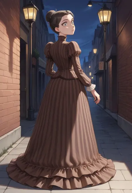 원본: 줄무늬 드레스, 갈색 드레스, 단추, 퍼프 소매