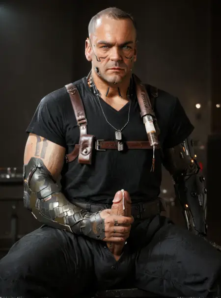 kurthansen,cyberware lines,stubble,mechanical arms,cyborg,bald