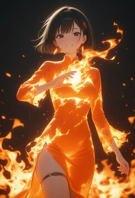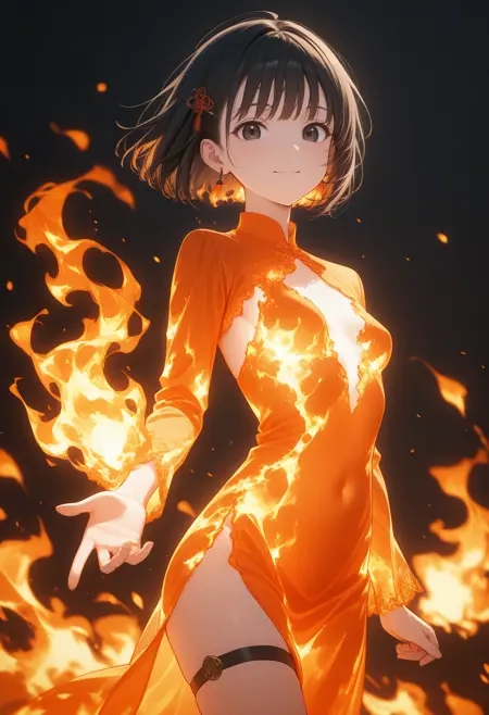 이 LoRA는 불에서 영감을 받은 배경과 옷을 생성하도록 설계되었습니다.
