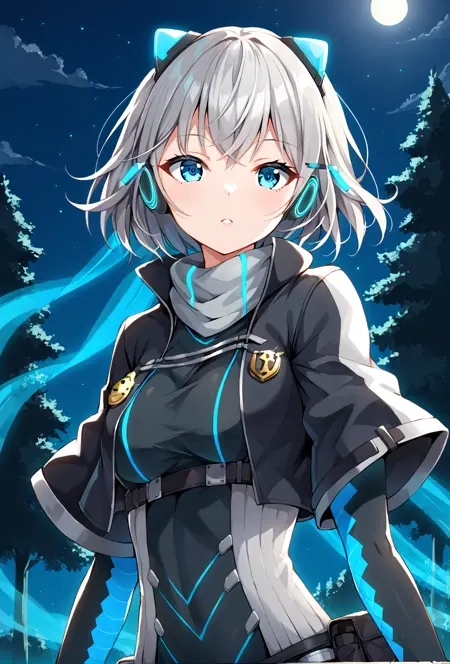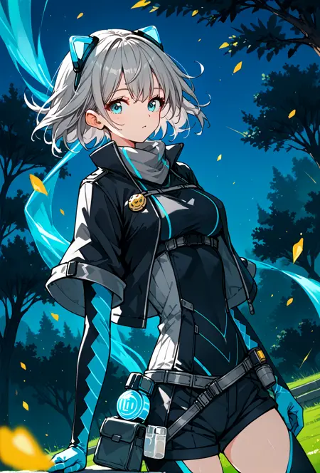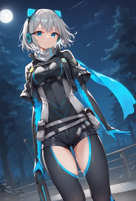 neon trim, grey scarf, cropped jacket, black jacket, black bodysuit, blue gloves, multiple belts, button badge, short shorts, taut clothes