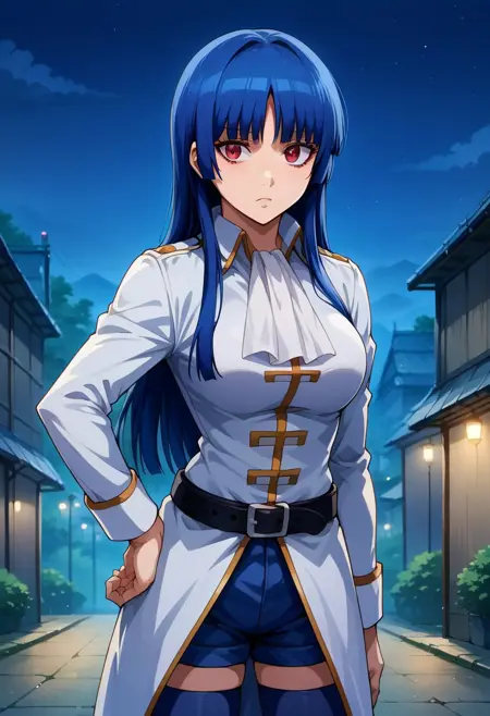 1girl, Nobume, blue hair, red eyes, long hair, uniform, belt, blue shorts, skirt, thighhighs