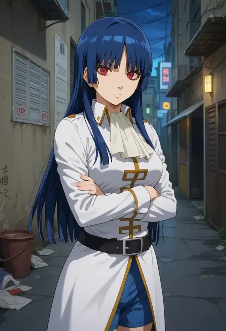 1girl, nobume, blue hair, long hair, uniform, blue shorts, thighhighs