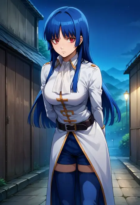 1girl, Nobume, blue hair, red eyes, long hair, uniform, belt, blue shorts, skirt, thighhighs