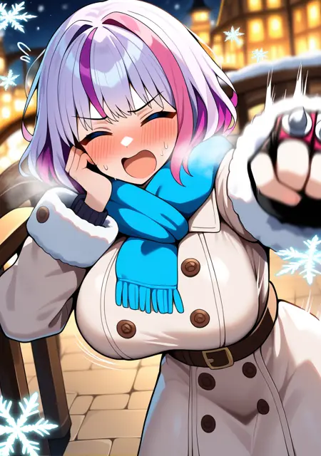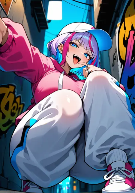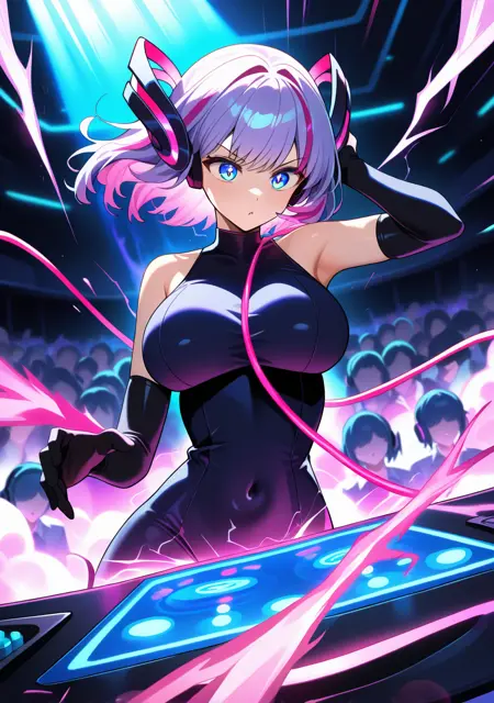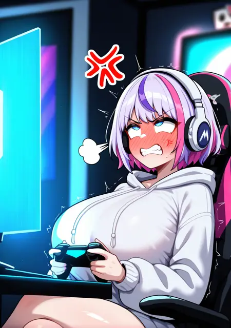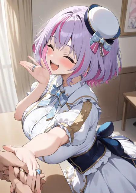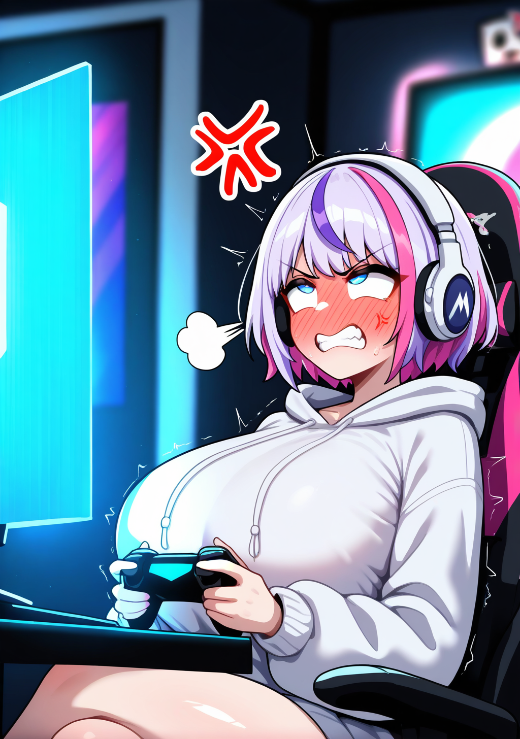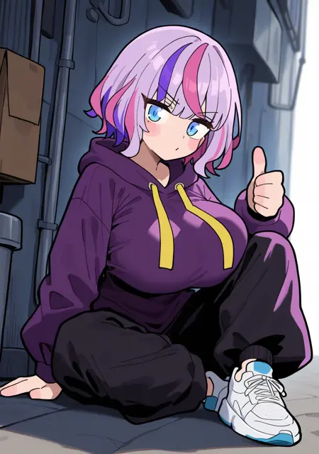 "巨大的胸部,蓝色眼睛,短发,多色头发,条纹发,紫色头发,粉色头发"